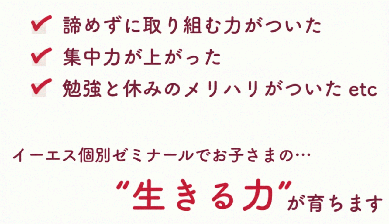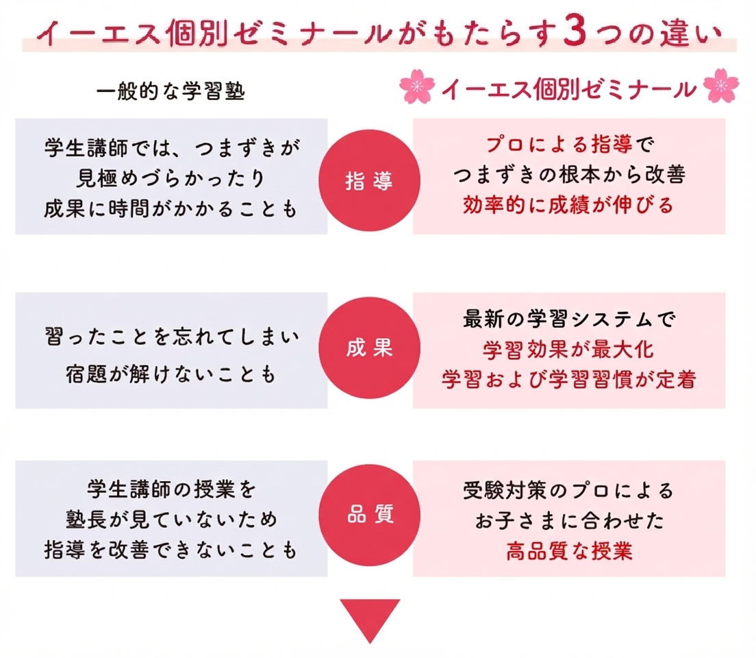 イーエス個別ゼミナールは教科書に対応するカリキュラムをつくるのはもちろん、どの子も授業についていけるよう、様々なテコ入れを、どの塾さんよりも先んじて取り組んでいます。