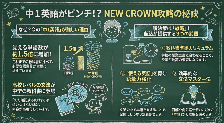 【第2回】単語数1.5倍!?中1 NEW CROWN攻略の秘訣は「戦略」にあり💡 こんにちは!✨ 松原市・堺市の地域密着型学習塾です🏠 前回のブログでは『NEW CROWN』の難化についてお話ししましたが、今回は具体的な「中身」のお話です。 ...